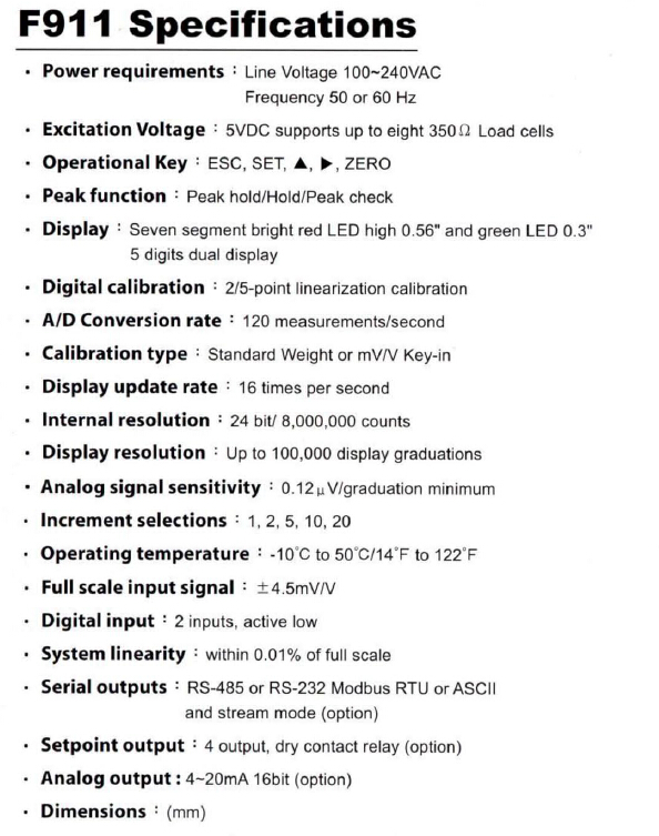 美國sensolink F911稱重儀表產(chǎn)品參數(shù):