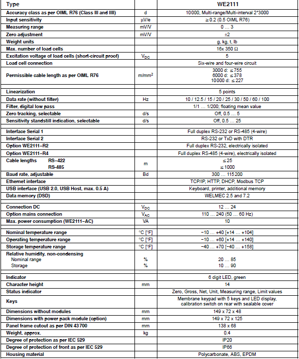 HBM WE2111稱重顯示控制儀表規(guī)格: